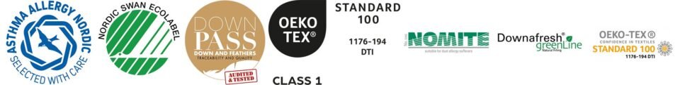 Pateicoties trīs slāņu struktūrai un atšķirīgajam pildījumam, SAMSØ spilveni pārmērīgi nesaplok, līdz ar to nodrošinot maksimālu relaksāciju un nepieciešamo atbalstu galvai un kaklam. Pīļu dūnas un spalvas ir izturīgas pret saspiešanu, tāpēc pēc spilvena mazgāšanas veļasmašīnā, tas nezaudē savu formu, paliek mīksts un gaisīgs. Dūnas labi uzsūc ķermeņa lieko mitrumu, nodrošina optimālu ķermeņa temperatūru un neļauj ādai pārkarst. Ideāls miega mikroklimats un ilgstošs komforts. Spilvena pārvalks šūts no Super Cambric auduma, kas izgatavots no augstas kvalitātes kokvilnas šķiedrām, cieši ieaustām vienkāršā pinumā, radot vieglu, gludu un spalvu necaurlaidīgu audumu. Spilvens ir izgatavots Dānijā, no labākajiem materiāliem, un piešķirtie sertifikāti garantē augstu kvalitāti, ilgu izturību un 100% hipoalerģisku komfortu. Tas ir piemērots cilvēkiem ar alerģijām un jutīgu ādu, jo tam ir piesķirts Ziemeļvalstu ekoloģiskais zīmols un tas ir ieteikts no Asthma Allergy Nordic. Sertifikāti: “Asthma Allergy Nordic” garantē, ka produkti nesatur izejmateriālus, kas varētu izraisīt ādas alerģijas. “Asthma Allergy Nordic” sadarbojas ar astmas un alerģijas organizācijām Norvēģijā, Zviedrijā un Dānijā. Jauns marķējums, kas klientiem atvieglo rūpīgi izvēlētu maigu produktu atrašanu. www.asthmaallergynordic.com Prasības marķētajiem produktiem ir tādas pašas kā tiem, kas marķēti ar Asthma Allergy Denmark – produkts nesatur optiskos balinātājus, formaldehīdu, smaržvielas un citas nevajadzīgas vielas un apstrādes līdzekļus, kas var kairināt elpceļus un izraisīt alerģijas. Ziemeļvalstu Gulbja ekomarķējums garantē, ka produkts ir viens no videi vismazāk kaitīgajiem savā kategorijā. Šeit noteiktās prasības ir stingrākas nekā tiesību aktos noteiktās. Uzzināt prasības precēm, kurām jāatbilst, lai saņemtu šo marķējumu: www.ecolabel.dk DOWNPASS garantē augstu kvalitāti un pārliecību, ka dūnas un spalvas, ko izmanto kā pildvielu, ir ētiskas izcelsmes un tiek iegūtas no stingri kontrolētām un izsekojamām piegādes ķēdēm. NOMITE zīme ir garantija, ka audums ir tik cieši austs, ka mājas putekļu ērcītes nevar izkļūt caur spilvena pārvalku. Oeko-Tex® Standart 100 ir plaši atzīts Austrijas Tekstila institūta (OTI) un Vācijas Hohenšteina pētniecības institūta izveidots starptautisks ekoloģiskais standarts. Šis ir standarts garantē to, ka produkts ir pārbaudīts attiecībā uz kaitīgām vielām, izmantojot atbilstošu pārbaudes metodiku. Oeco-Tex® Standart 100 sertifikāts apzīmē drošus materiālus, kas vidē neizdala toksiskas gaistošas daļiņas. Produkti ar apzīmējumu „Uzticēšanās tekstilam” garantēti nesatur alerģiskas vielas, formaldehīdus, smagos metālus vai aizliegtus pesticīdus. Sertifikācija ietver gan spilvena pārvalkus, gan pildvielas. Lai iegūtu šo sertifikātu, tiek novērtēts viss izstrādājums: pārvalks, šujamie diegi un dažādi aksesuāri ja tādi paredzēti (pogas, rāvējslēdzējs utt.). Downafresh® greenLine nozīmē, ka spilvena pildījums apstrādāts atbilstoši ekoloģiskām prasībām. Pildījuma apstrādē izmantoti mazgāšanas līdzekļi, kas saudzē vidi un pildījuma materiāla dabiskumu. Zīmola Downafresh® greenLine lietotājiem ir pienākums regulāri pārbaudīt savus produktus neatkarīgā testēšanas laboratorijā, lai nodrošinātu higiēnas, tīrības un videi draudzīgu prasību ievērošanu. Ražotājs: Quilts Of Denmark, Dānija.