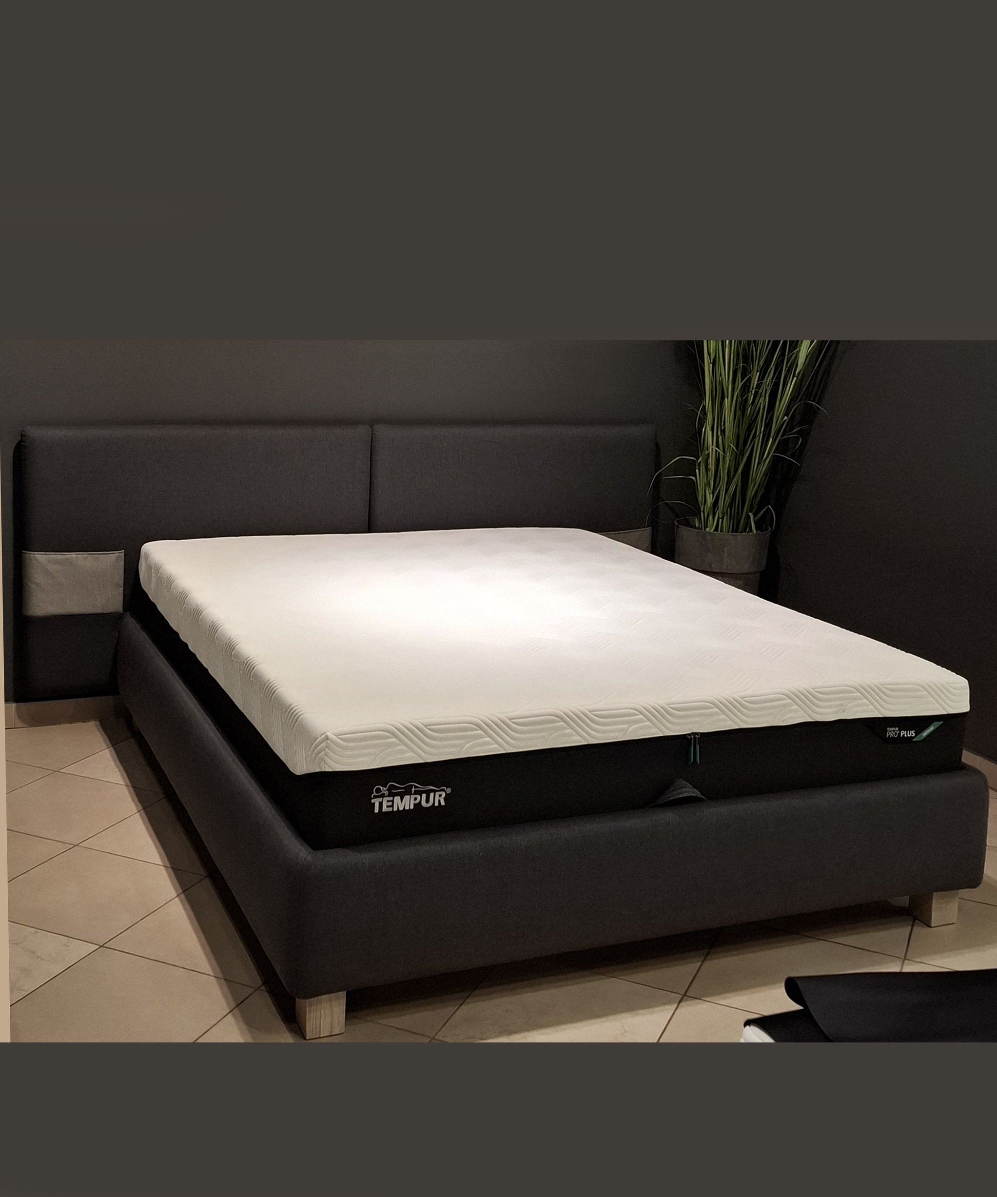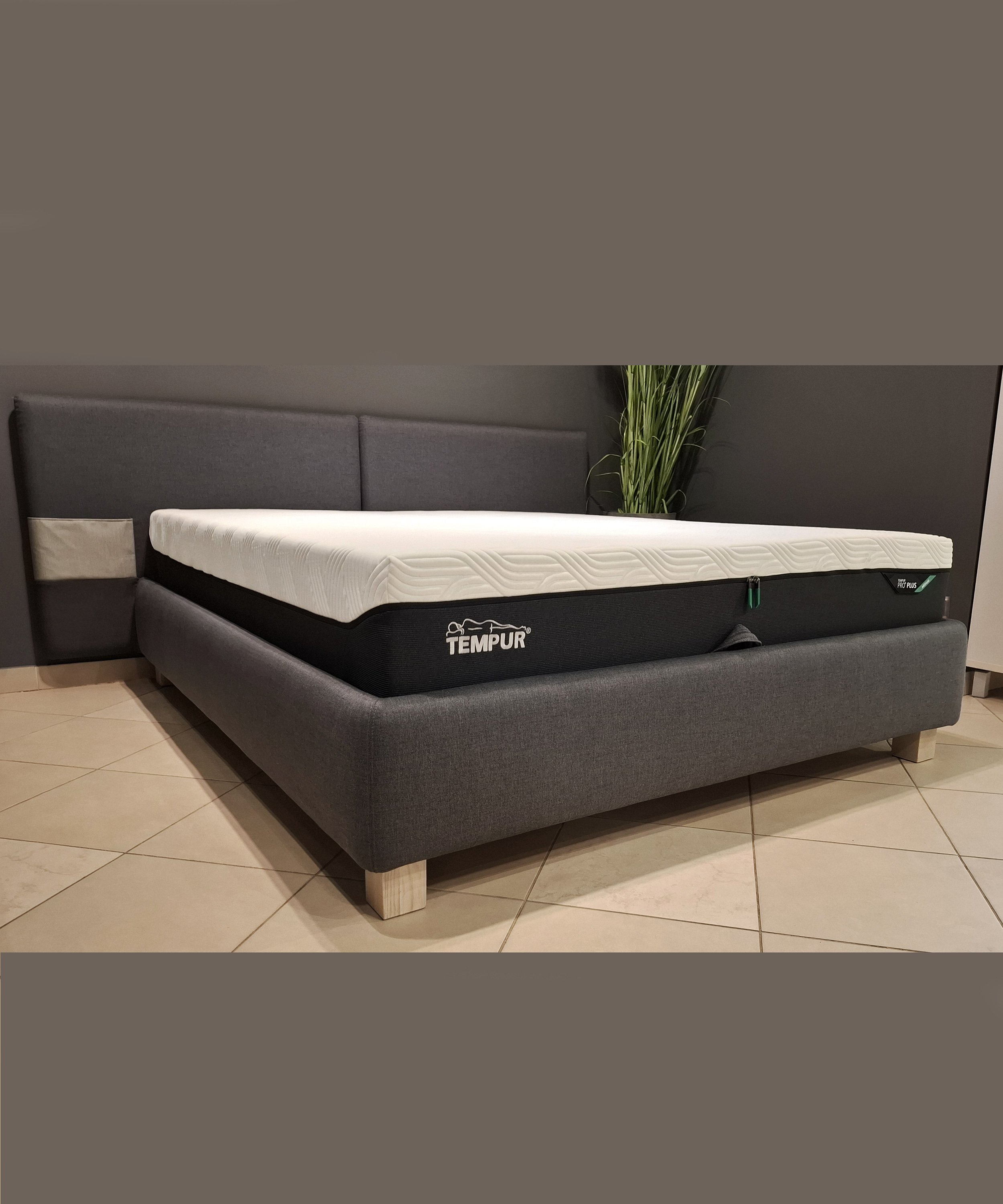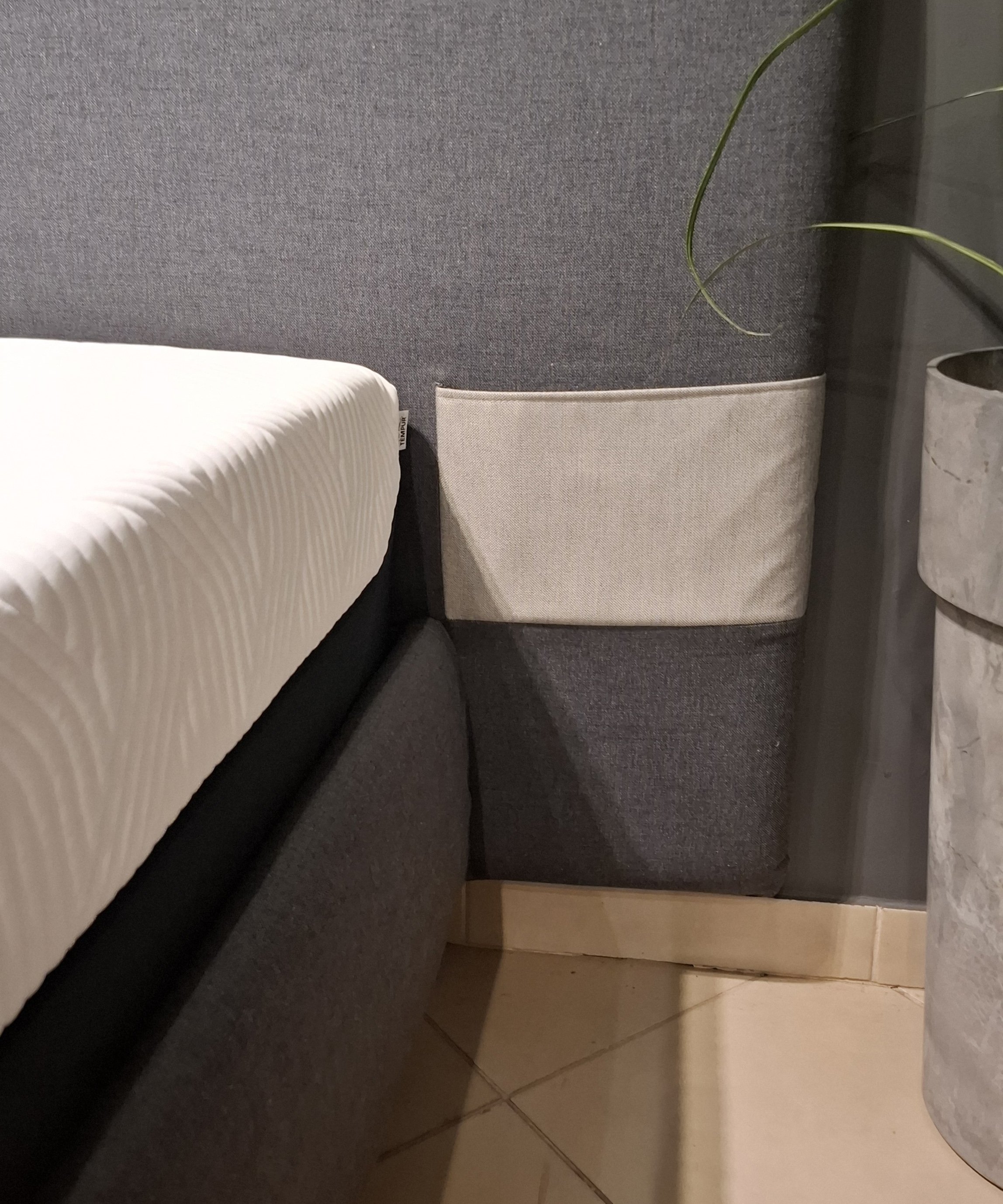Pelēka divguļamā gulta CAMELLO ar polsterētu rāmi, lielu galvgali un gaiši pelēkām kabatām galvgaļa abās pusēs. Īpaši izturīga gultas konstrukcija – pastiprināta ar metāla rāmi. Augstas kvalitātes vācu pneimatiskie rāmju pacēlāji. Uz augšu paceļama blīva ortopēdiska matrača redele.