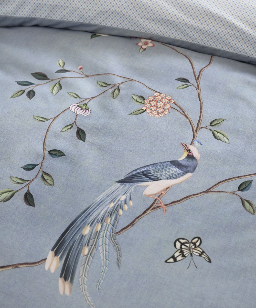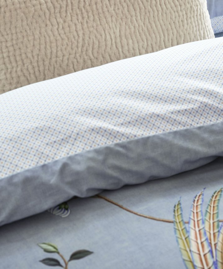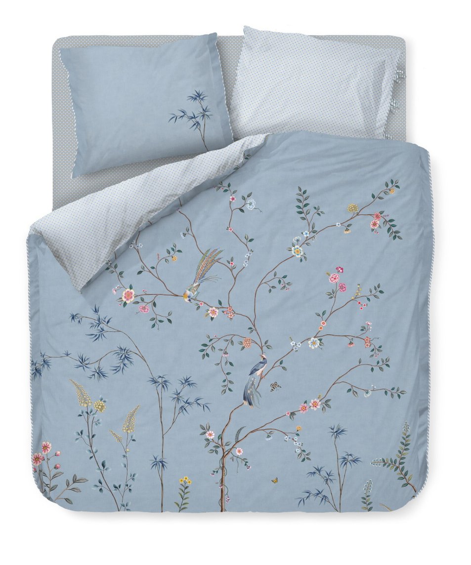 Gultas veļas komplektā Bamboo Blossom Khaki attēlota ainava ar smalkiem, ziedošiem kokiem un bambusa dzinumiem, kuru papildina putnu attēli. Otra puse pārvalkam un spilvendrānai ir ar smalku, stilizētu rūtiņu rakstu, gaiši zilos toņos.