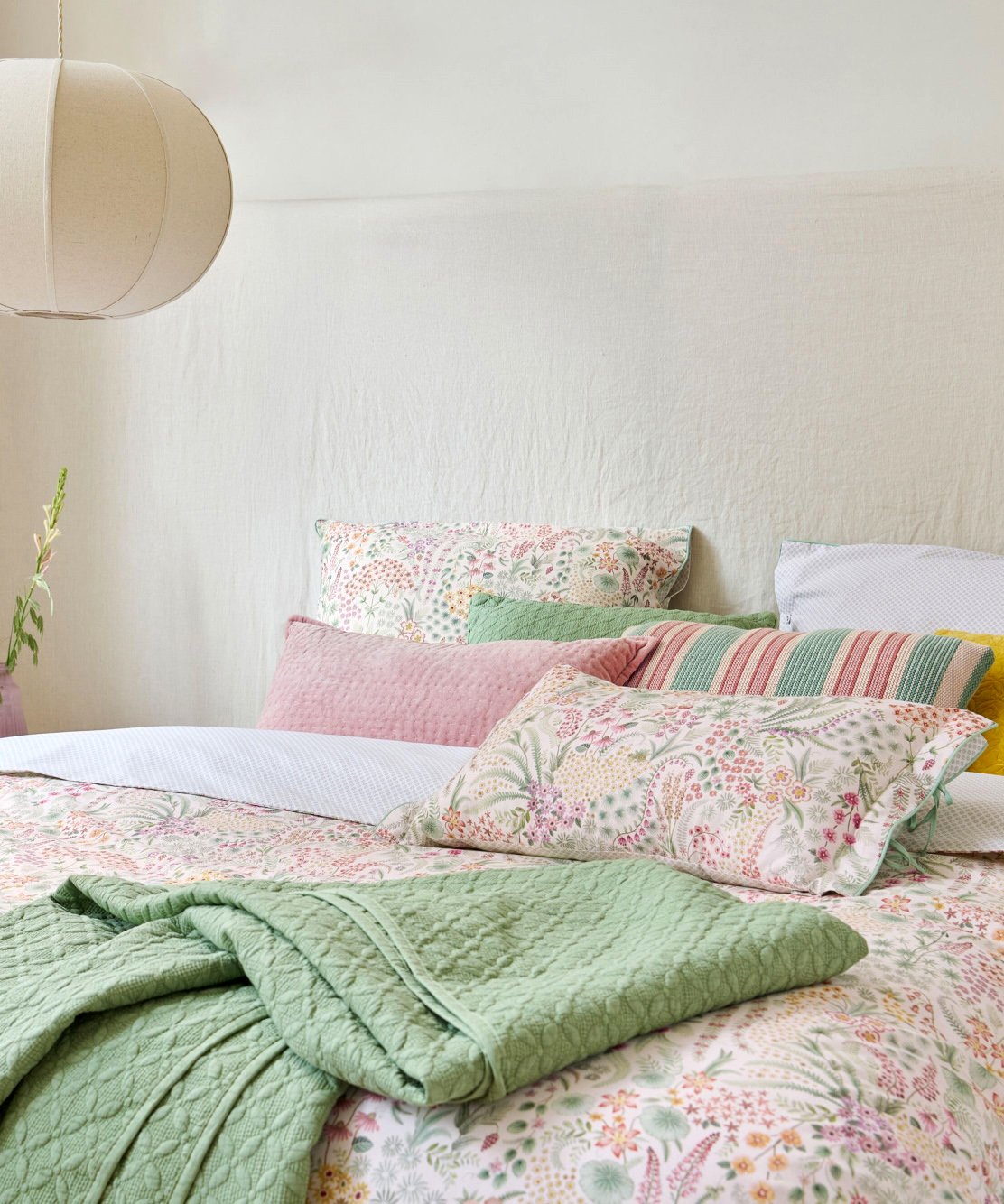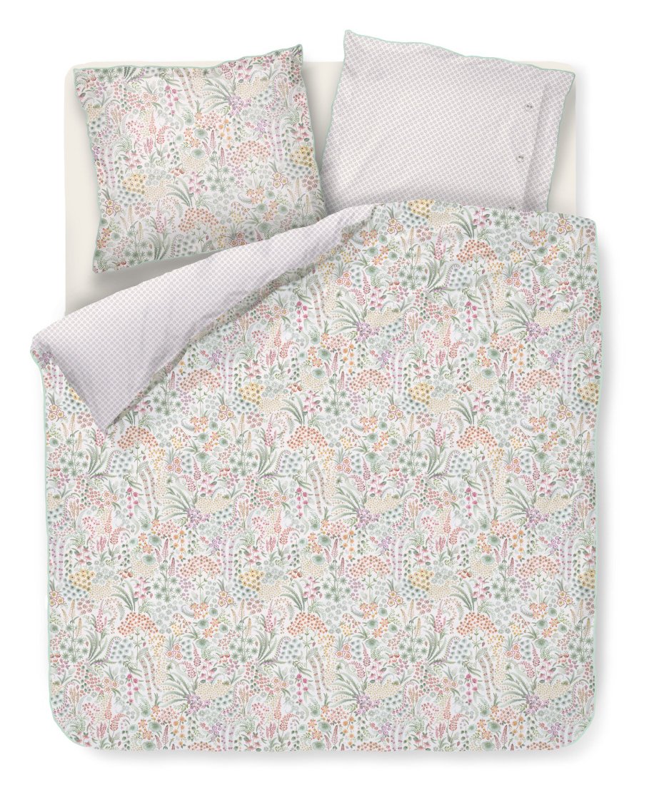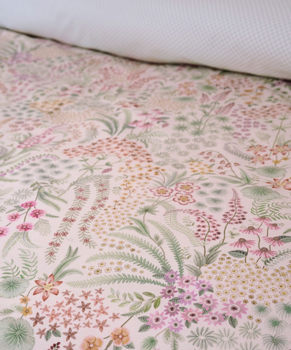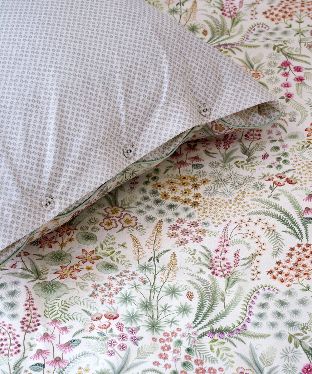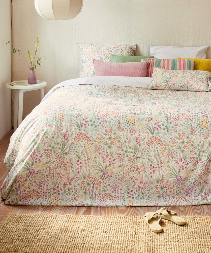 Gultas veļas komplekts ar smalkiem ziedu motīviem. Otra puse ar neuzkrītošu zvaigžņu rakstu pieskaņotos toņos. Spilvendrānas ar dekoratīvām pogām, un tā pat kā segas pārvalks, ar dažādiem rakstiem katrā pusē, ļaujot variēt ar stiliem.