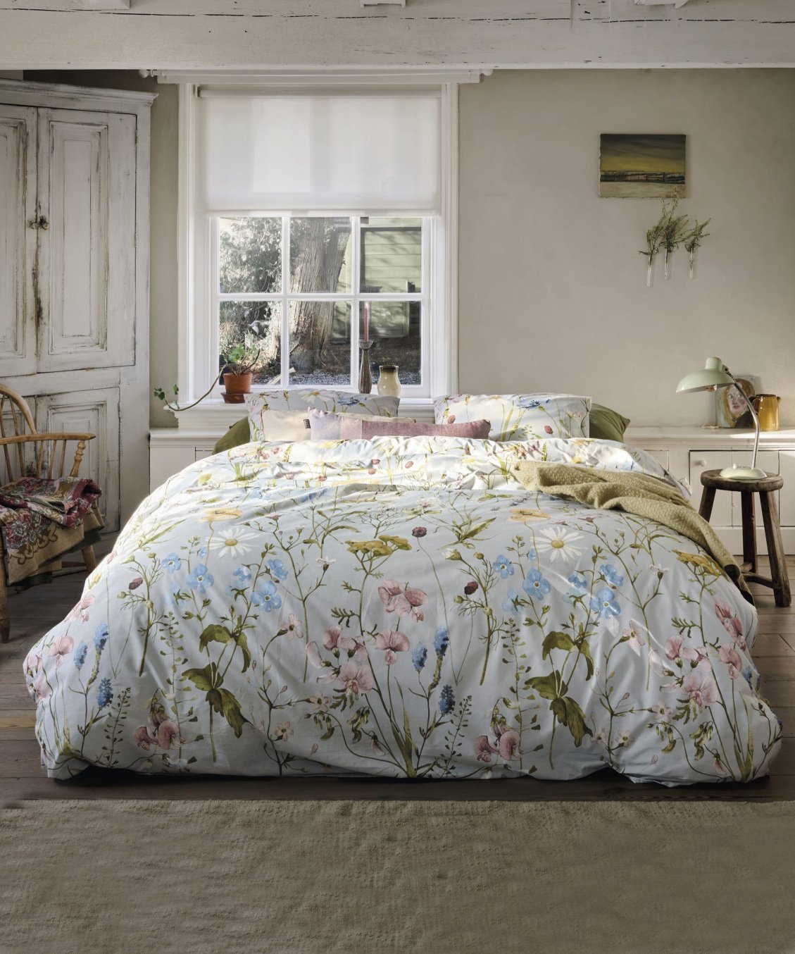 Bloom Blue gultas veļa komplekts no Ariadne at Home kolekcijas piešķir guļamistabai dzīvīgumu ar spilgtu magoņu, rudzupuķu, margrietiņu un citu pļavas ziedu rakstu. Dizains rada mierīgu lauku noskaņu. Augstas kvalitātes kokvilnas audums, tas ir izturīgs un patīkams pieskārienam.