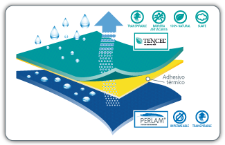 Membrāna (zem TencelTM slāņa, kas ir saskarē ar matraci) – 100% poliuretāns, ūdens necaurlaidība nodrošināta izmantojot laminēšanas sistēmu PERLAMTM.